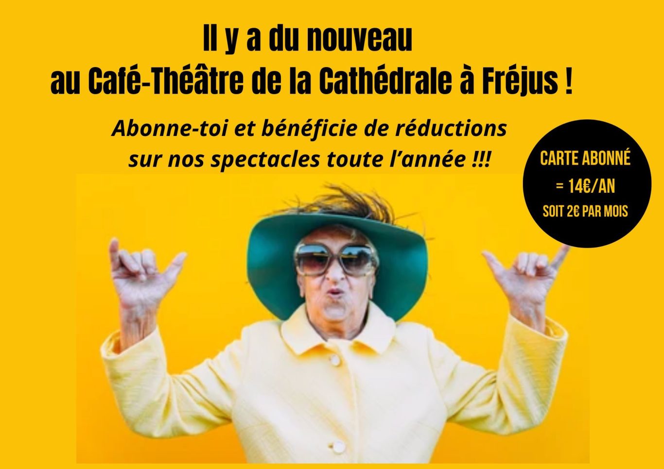 Notre carte abonné permet de bénéficier de tarifs très avantageux sur tout les spectacles programmés au Café-Théâtre de la Cathédrale à Fréjus mais aussi dans d'autres salles de la Région.